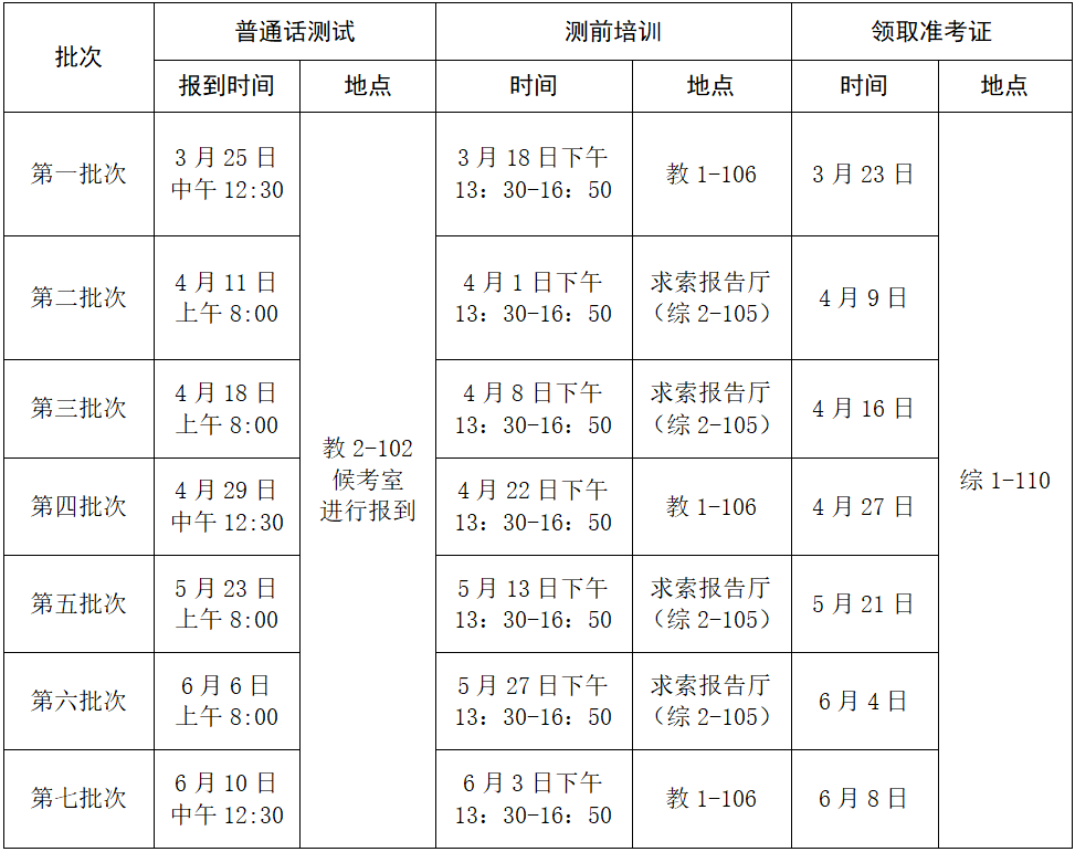 现将2026年上半年七个批次普通话测前培训及考试安排通知如下: