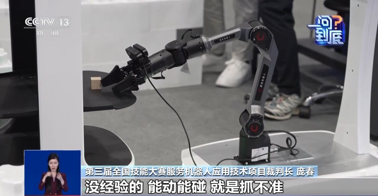 第三届全国技能大赛服务机器人应用技术项目裁判长 庞春:最难的其实就是精度的调试,比如机械手臂要抓,有经验的、水平高的,很快调,抓得准;没经验的,能动能碰,就是抓不准,水平就在这里体现。