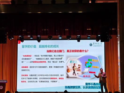 在留学专题讲座现场,来自华中师范大学出国留学服务中心的资深指导老师陈竞教授从留学探索世界、海外硕士留学申请规划、雷克瑟姆大学硕士直通车项目以及海外生活就业4个板块深入浅出地为同学们解读了海外留学、就业政策,留学升学的优势及选择,分享留学升学经验。同时,陈竞教授也鼓励同学们提前明确目标,开始语言考试准备,升学尤其是出国留学会成为接下来同学们值得关注的新选择。他希望全体同学都能正确规划,把握契机,找对未来发展的方向,成就更好的自己。